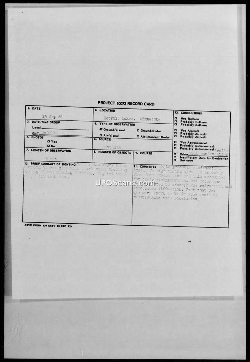 Project 10073 Record Card and UFO Report — Detroit Lakes, Minnesota, 25 September 1961