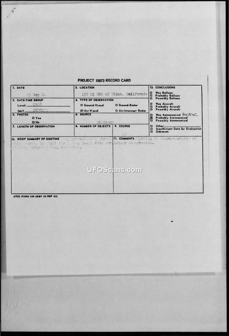 On September 25, 1961, at 2308 local time, the crew of an RC-121D aircraft (Ethan 45) operating 150 miles WNW of the Ukiah TACAN in California observed an unidentified aerial phenomenon. The crew, consisting of Major John Whalen, Captain John P. Convey Jr., and Captain Robert Bell, reported seeing a long, bluish-green streak with bright white edges. The object appeared suddenly, exhibiting extreme brightness that illuminated the interior of the aircraft cockpit, before fading rapidly over a duration of three seconds. The weather conditions were reported as clear with bright moonlight. The sighting was documented in a Project 10073 record card and a subsequent Moon Dust report submitted under AFR 200-2. Intelligence Officer 2LT Richard A. Kahane noted that the observers were considered reliable and had no ulterior motives. The report explicitly mentions the observer's claim that the object was 20 times brighter than a typical meteorite. The official conclusion provided in the report suggests the phenomenon was a possible re-entry of an ESV (Earth Satellite Vehicle).