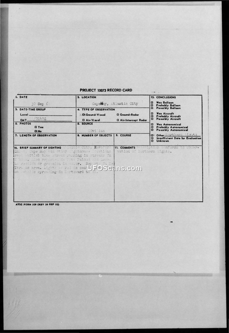 This document collection contains a series of reports and correspondence related to Project 10073, documenting various unidentified aerial phenomena (UAP) sightings reported in late 1961. The primary incident, recorded on 30 September 1961, involved reports from multiple Coast Guard stations in the Cape May and Atlantic City area. Witnesses described a 'whitish blue light' moving in streaks from east to west, which was later identified as Northern lights. The file also includes several press clippings and reports of other sightings, such as a tear-drop-shaped object spotted by two pilots in Bloomfield, New Jersey, and a triangular UFO observed by Mr. and Mrs. Seal on Route 90. Another report mentions a 16mm film of an elongated UFO in Waynesboro, Virginia, which was turned over to NICAP for analysis. A summary table of sightings from 1 to 14 October 1961 categorizes various events, with many attributed to astronomical phenomena like meteors, sun dogs, or Jupiter, while others remained classified as 'insufficient data' or 'other' (such as light refraction or contrails). The document concludes with a letter from Major William T. Coleman, Jr., of the USAF, responding to a civilian inquiry regarding a sighting in Duluth, Minnesota, stating that the Air Force had no record of such an event in that area at that time. The collection also includes an educational article from the August 26, 1961, issue of Science News Letter, which provides context on astronomical observations, specifically regarding Jupiter and its satellites, likely intended to assist in identifying potential misidentifications of celestial bodies.