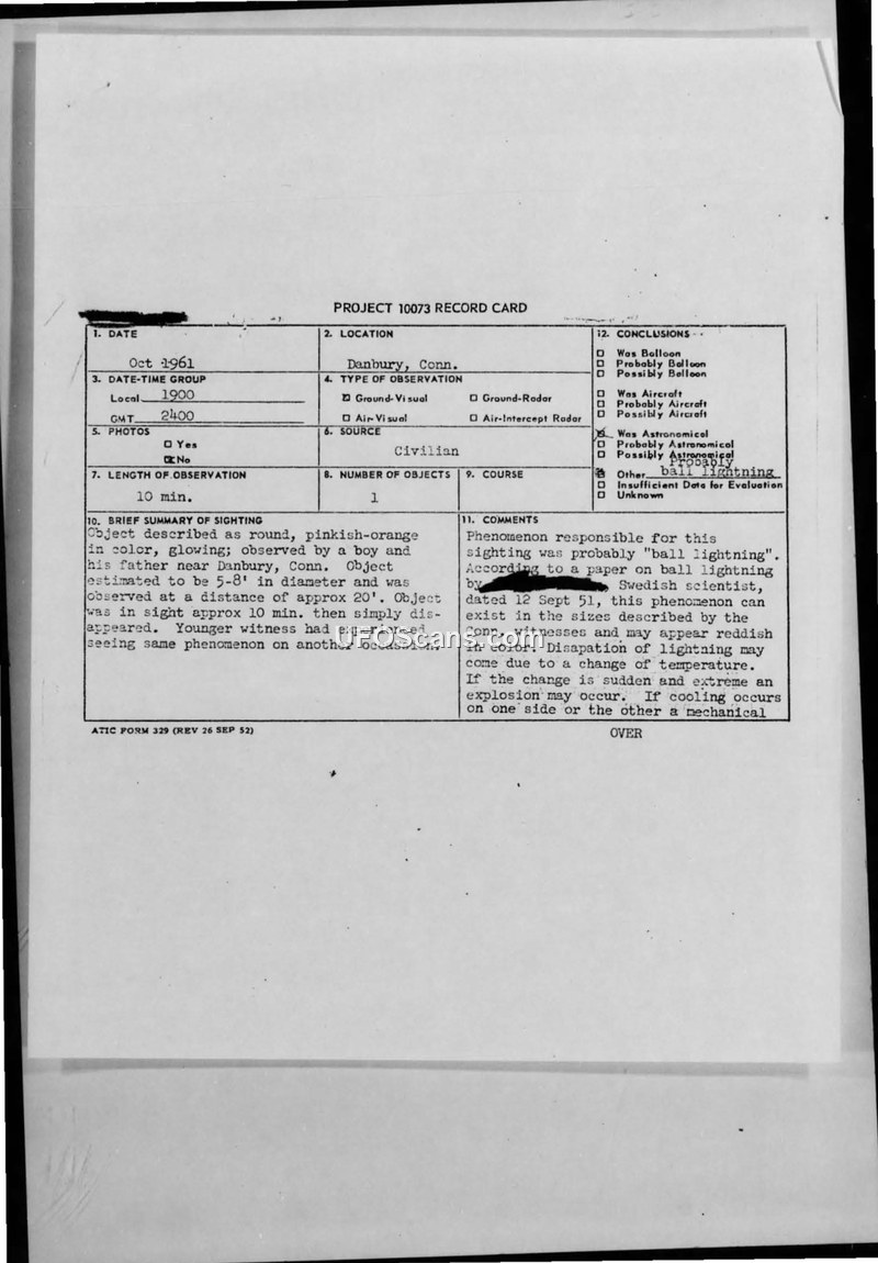 A 17-year-old witness reported a glowing, round object near Danbury, Connecticut, in October 1961. The Air Force officially classified the incident as likely being ball lightning.