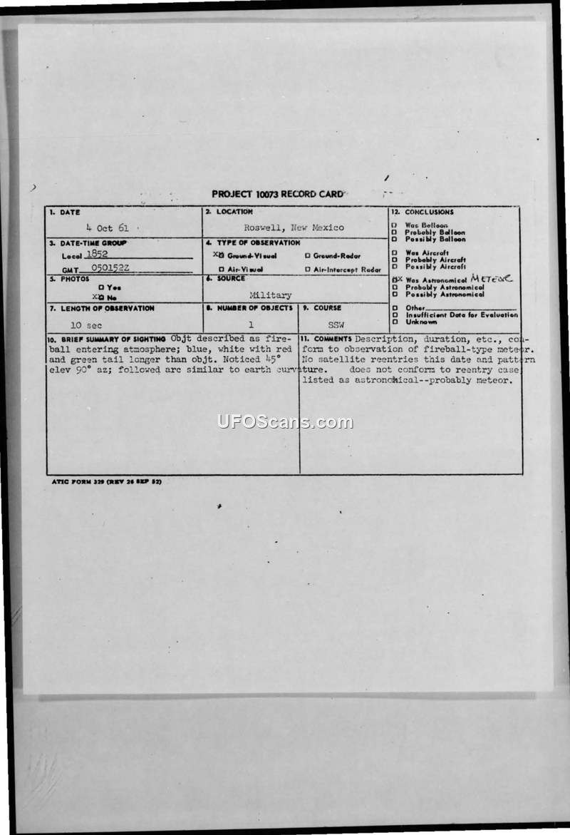 A USAF Captain reported a fireball-like object over Roswell, New Mexico, on October 4, 1961. While the observer questioned its natural origin, official military evaluation concluded it was a meteor.