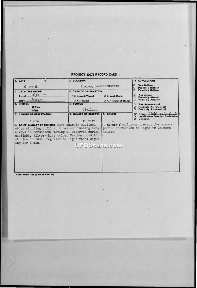 A 14-year-old witness reported five saucer-shaped objects in Sharon, Massachusetts, on October 6, 1961. The Air Force officially concluded the event was caused by light refraction.