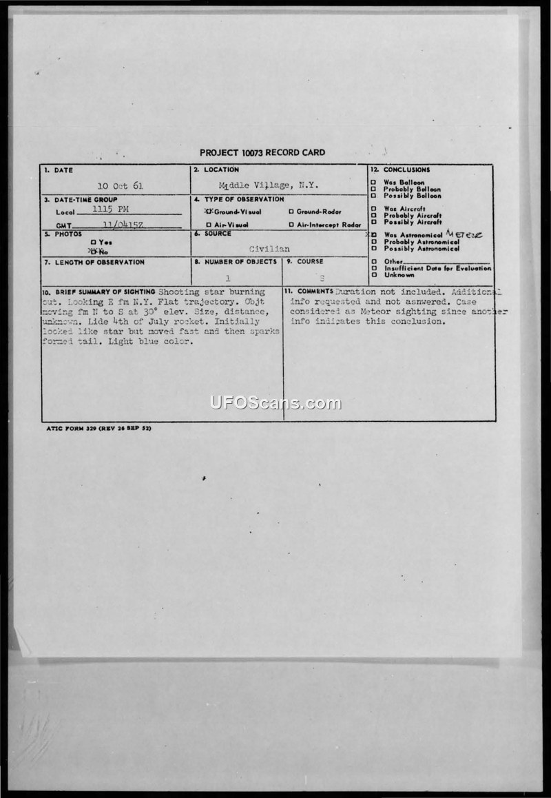 Project 10073 Record Card — Middle Village, N.Y., 10 October 1961
