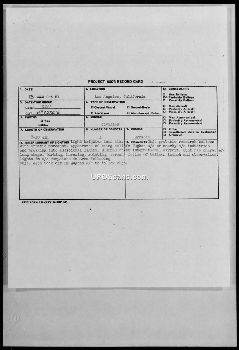 Project 10073 Record Card — Los Angeles, California, 13 October 1961