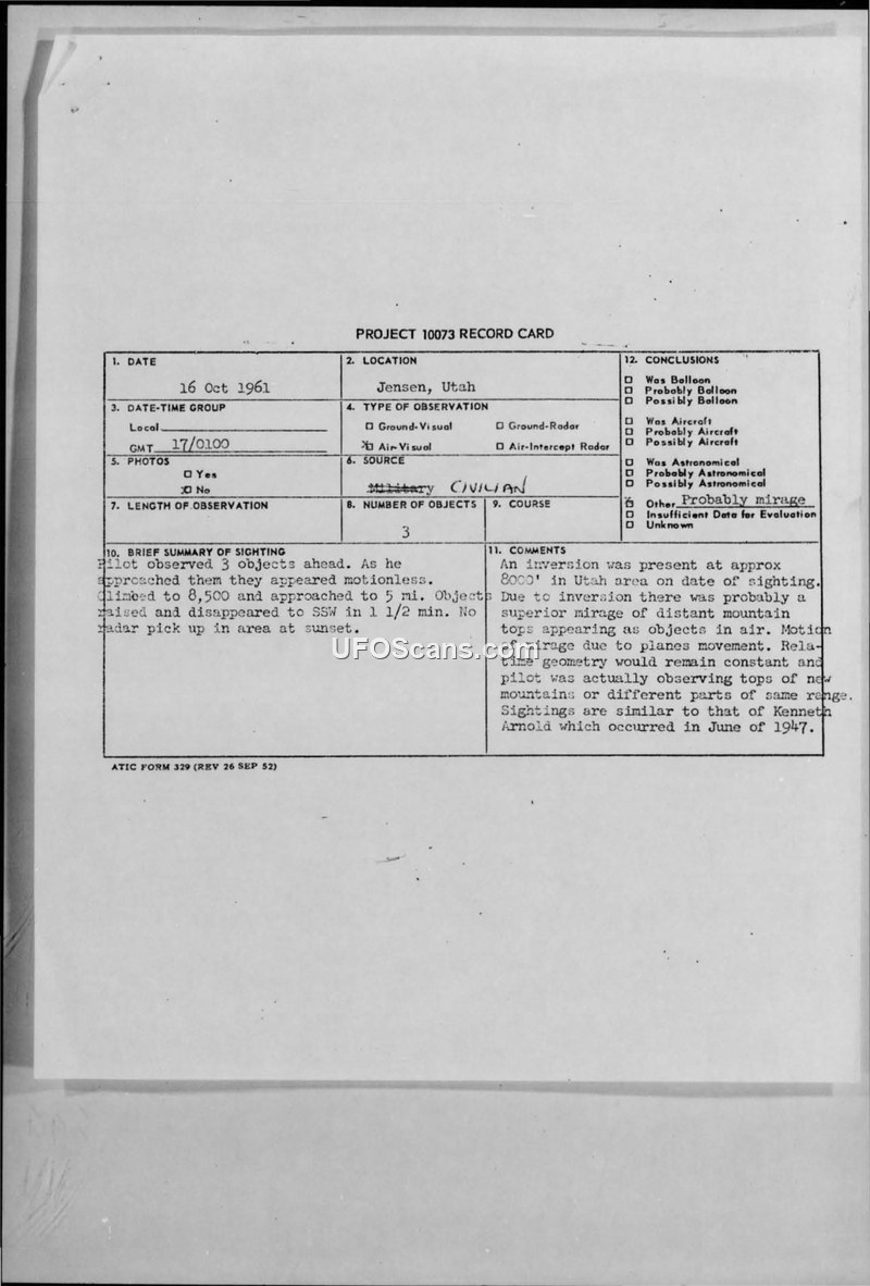 A civilian pilot reported three unidentified objects near Jensen, Utah, on 16 October 1961. The Air Force investigation concluded the sighting was likely a superior mirage caused by a temperature inversion.