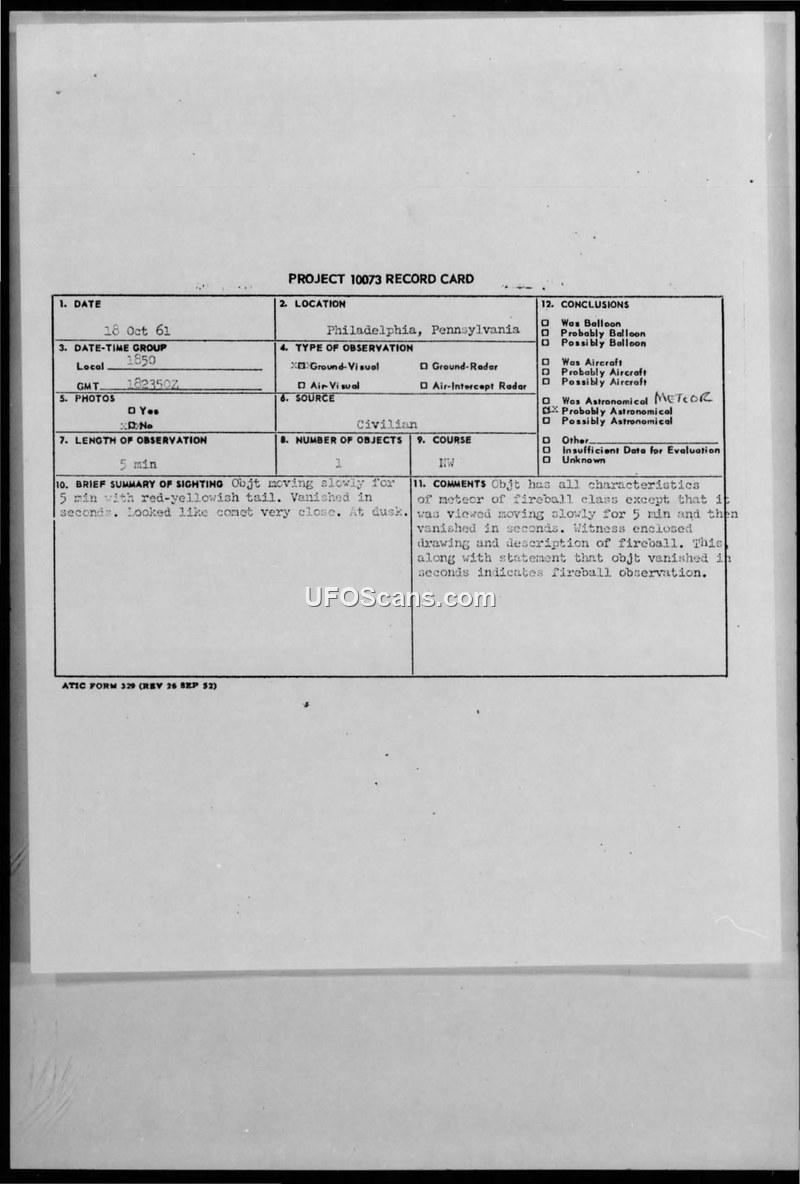 A 1961 sighting report from Philadelphia describes a silent, comet-like object with a red-yellowish tail. The Air Force officially concluded the object was likely a meteor.
