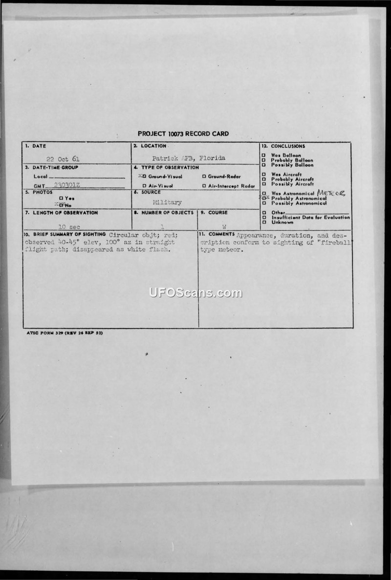 A pilot at Patrick AFB reported a 10-second sighting of a red, circular object on 23 October 1961. The Air Force concluded the object was a fireball meteor.