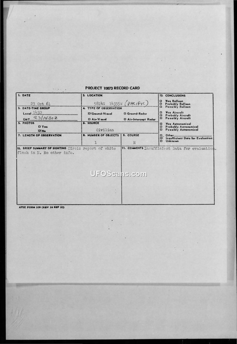 A civilian ship crew reported a mysterious white flash in the Pacific on October 23, 1961. The military investigation concluded there was insufficient data to identify the source of the flash.