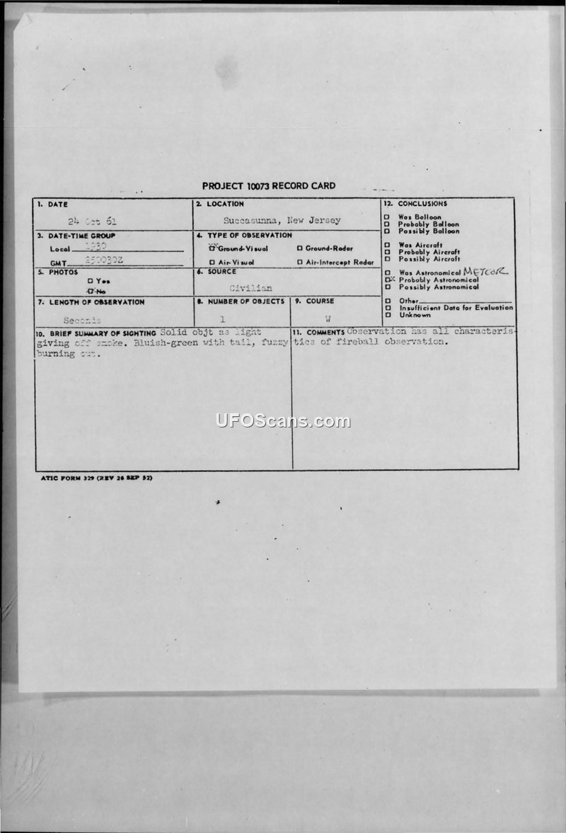 Project 10073 Record Card — Succasunna, New Jersey, October 24, 1961