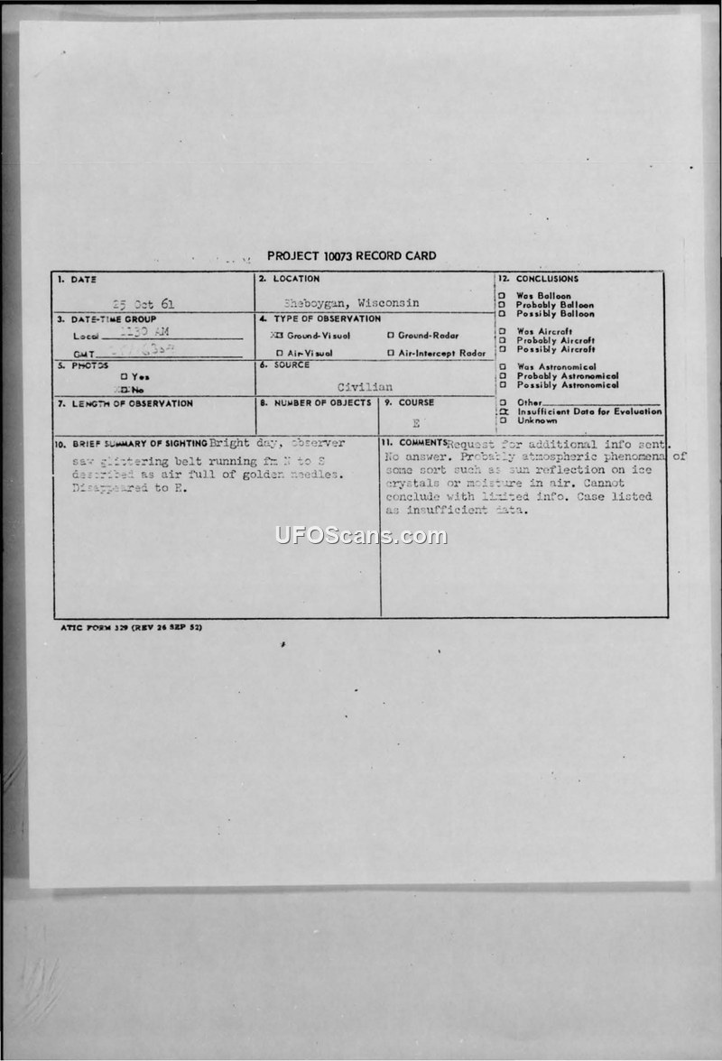 PROJECT 10073 RECORD CARD — Sheboygan, Wisconsin, 25 Oct 61