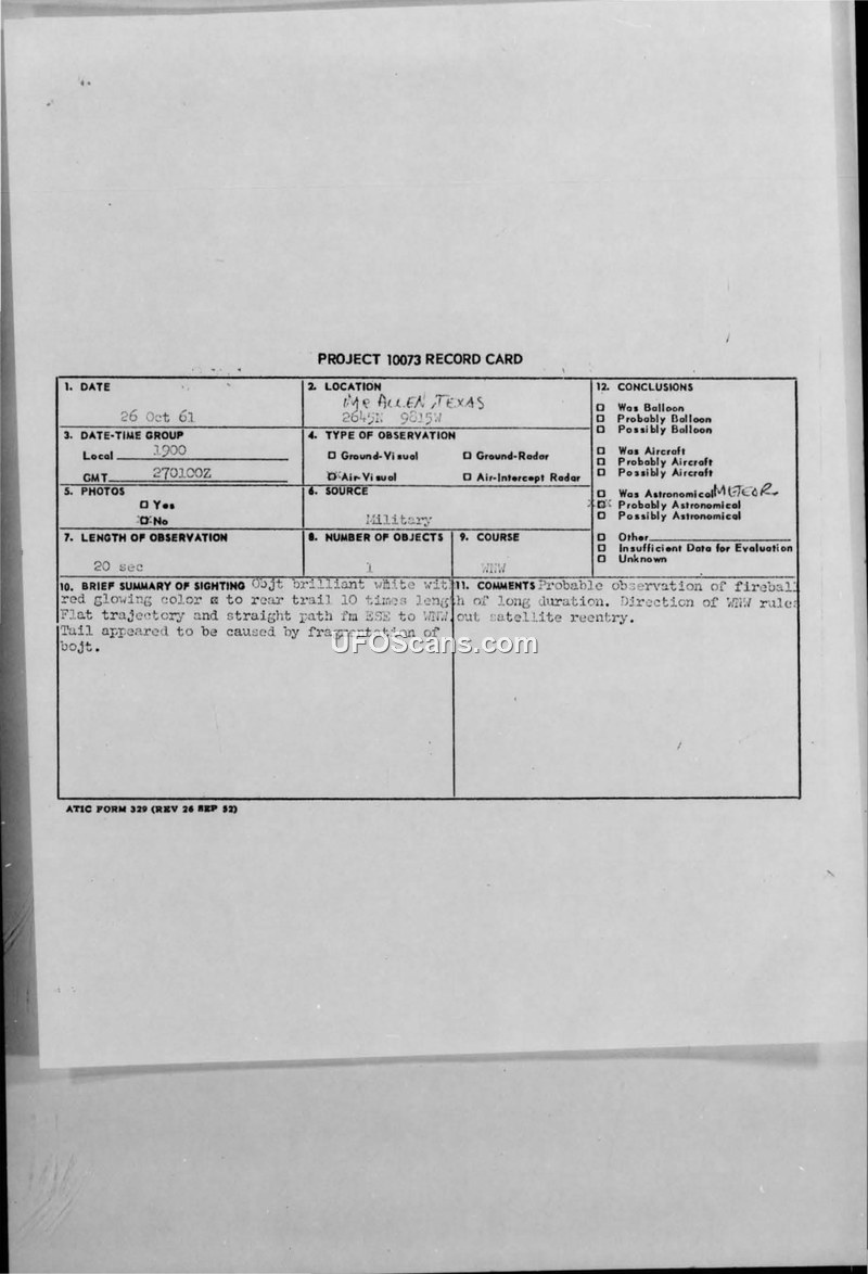 A T-29 aircraft crew reported an oblong, glowing object in the Texas sky on October 27, 1961. ATIC investigated the report, ultimately concluding it was likely a meteor or rocket body.
