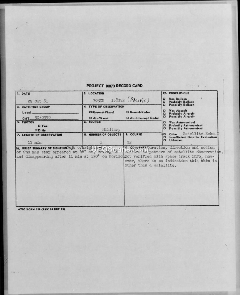 Project 10073 Record Card - Sighting of 30 October 1961