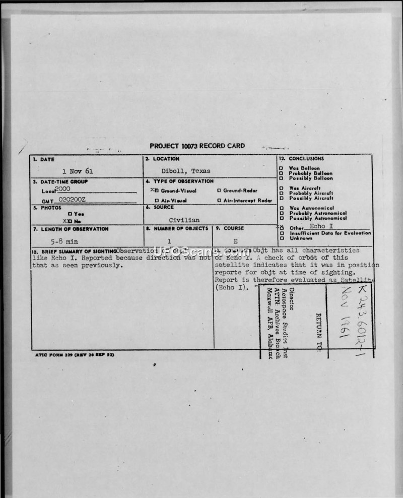 A civilian in Diboll, Texas, reported a bright, star-like object on November 1, 1961. The U.S. Air Force investigated the incident and concluded the object was the Echo I satellite.