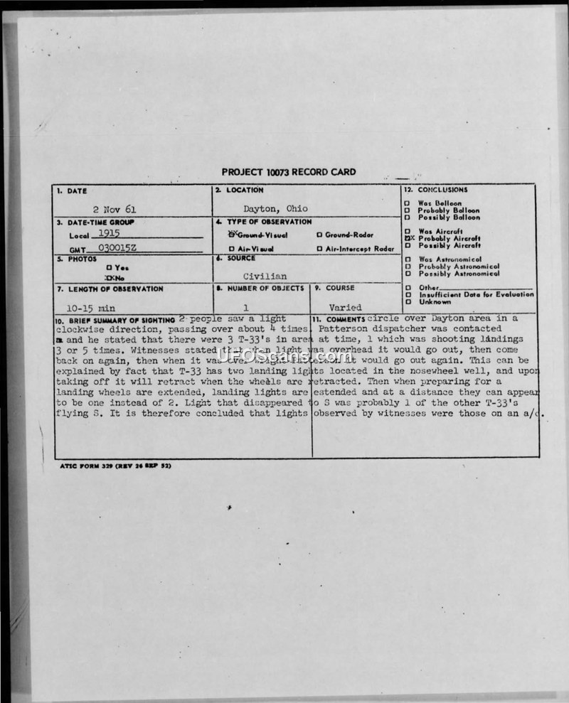 This document contains a series of Project 10073 Record Cards and associated U.S. Air Force Technical Information Sheets documenting three separate unidentified aerial phenomena sightings reported in Dayton, Ohio, during November 1961. The first incident, occurring on November 2, 1961, involved witnesses observing a light circling the Dayton area in a clockwise direction. Air Force investigators concluded that the light was likely from a T-33 aircraft performing landing patterns, noting that the aircraft's landing lights could appear as a single light at a distance. The second incident, reported on November 11, 1961, involved a stationary, fluctuating red and green object. This was evaluated as the star Sirius, with the perceived motion attributed to autokinesis and the appearance to scintillation. The third incident, reported on November 12, 1961, described a bright, starlike object moving in the sky. This was identified as the Echo I satellite, with the witness's report of direction and timing conforming to the satellite's known passage. The documents include detailed questionnaires completed by the witnesses, providing information on their location, the duration of the sightings, and their observations of the objects' appearance and behavior. The reports consistently indicate that the witnesses were civilians and that no photographic or radar evidence was obtained. The official conclusions for all three cases were that the phenomena were conventional, identifiable objects or celestial bodies.