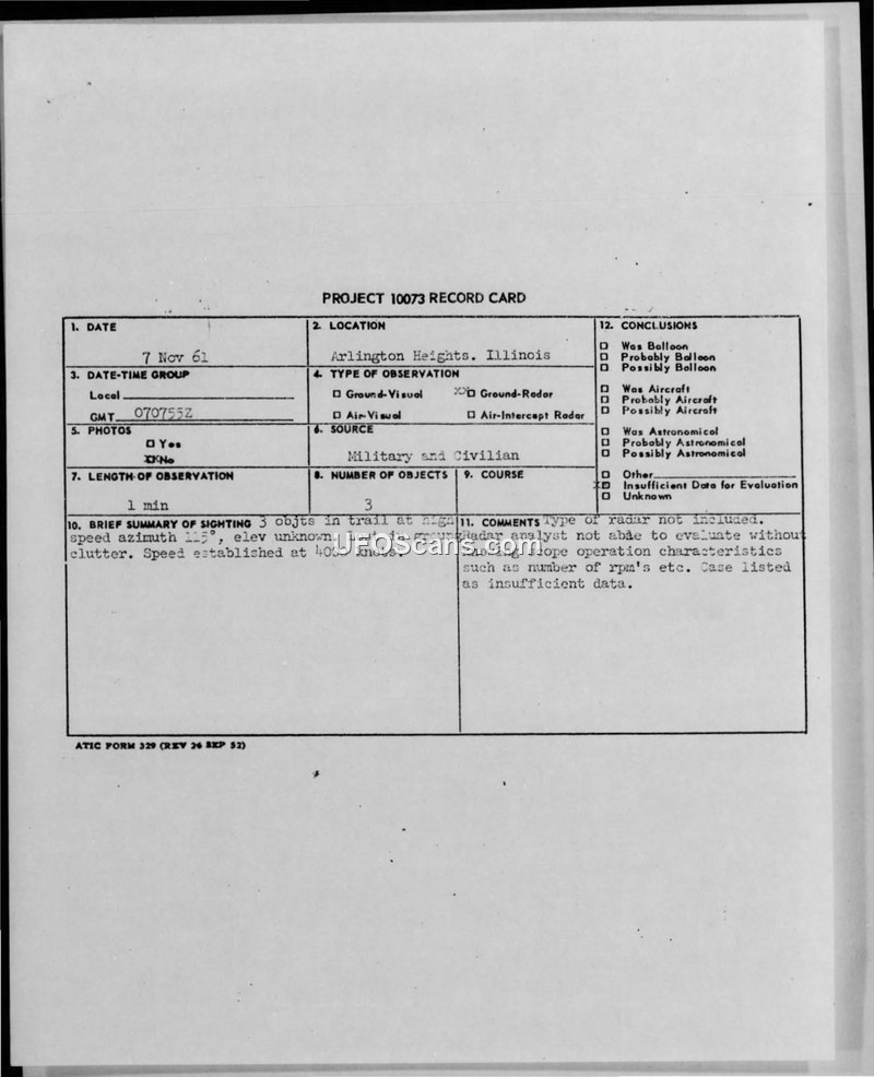 Project 10073 Record Card and Incoming Message — Arlington Heights, Illinois, 7 November 1961