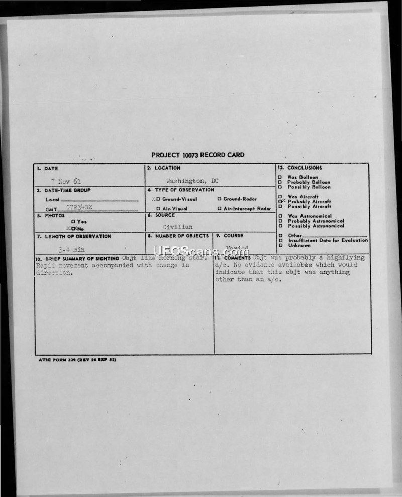 A student in Washington, D.C. reported a round, star-like object moving near the Small Dipper on November 7, 1961. While the official aerodrome assessment was 'unknown,' the project record card concluded it was likely a high-flying aircraft.