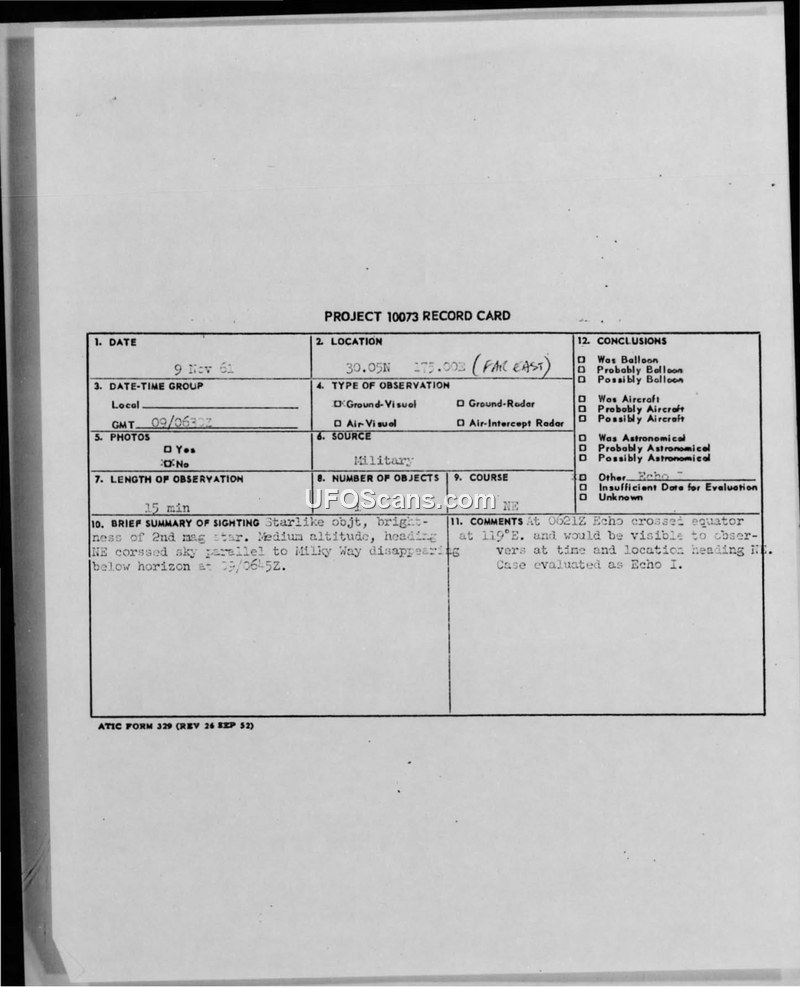 Project 10073 Record Card: Sighting Report - 9 Nov 61