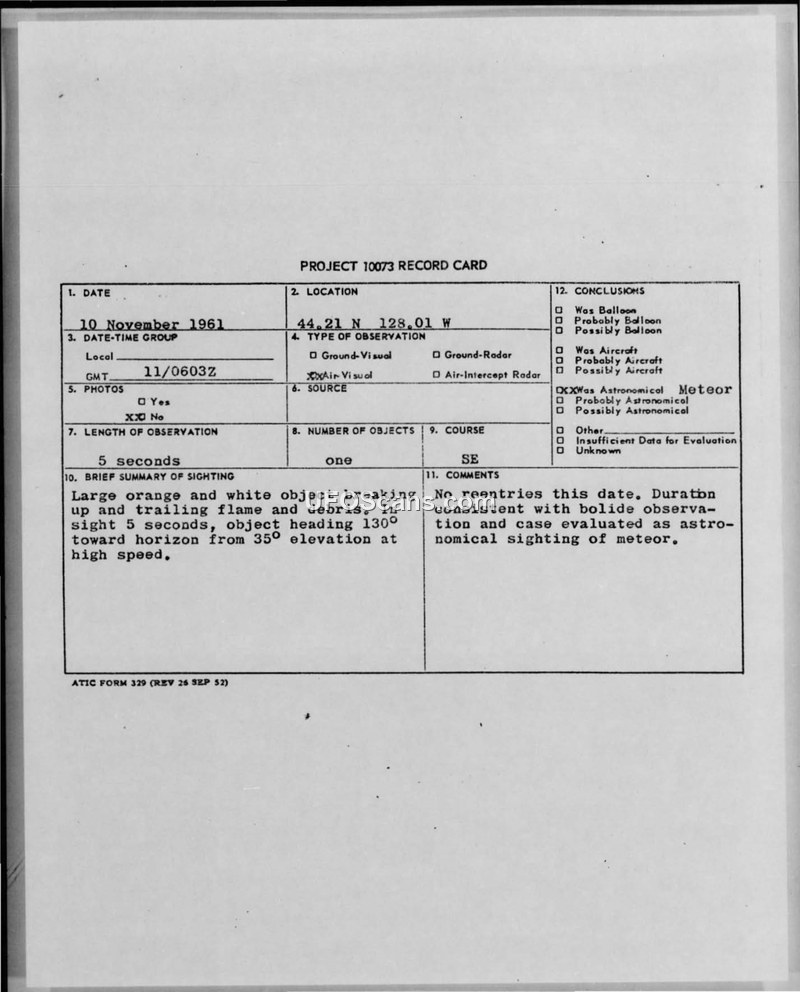 On November 10, 1961, at 0603Z, a CIRVIS (Communication Instructions for Reporting Vital Intelligence Sightings) report was filed regarding an aerial observation at coordinates 44.21 N 128.01 W. The witness reported observing a large orange and white object that appeared to be breaking up, trailing flame and debris. The object was in sight for approximately five seconds, traveling at high speed from an elevation of 35 degrees toward a heading of 130 degrees. The incident was documented on a Project 10073 record card and transmitted via a Department of the Air Force staff message. Official analysis concluded that the observation was consistent with a bolide, or a bright meteor. The report notes that there were no recorded reentries of man-made objects on that date, supporting the conclusion that the sighting was an astronomical event.
