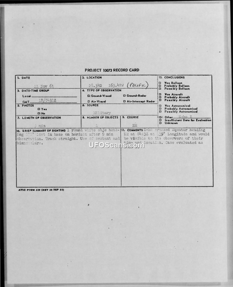Project 10073 Record Card — Sighting Report 12 November 1961