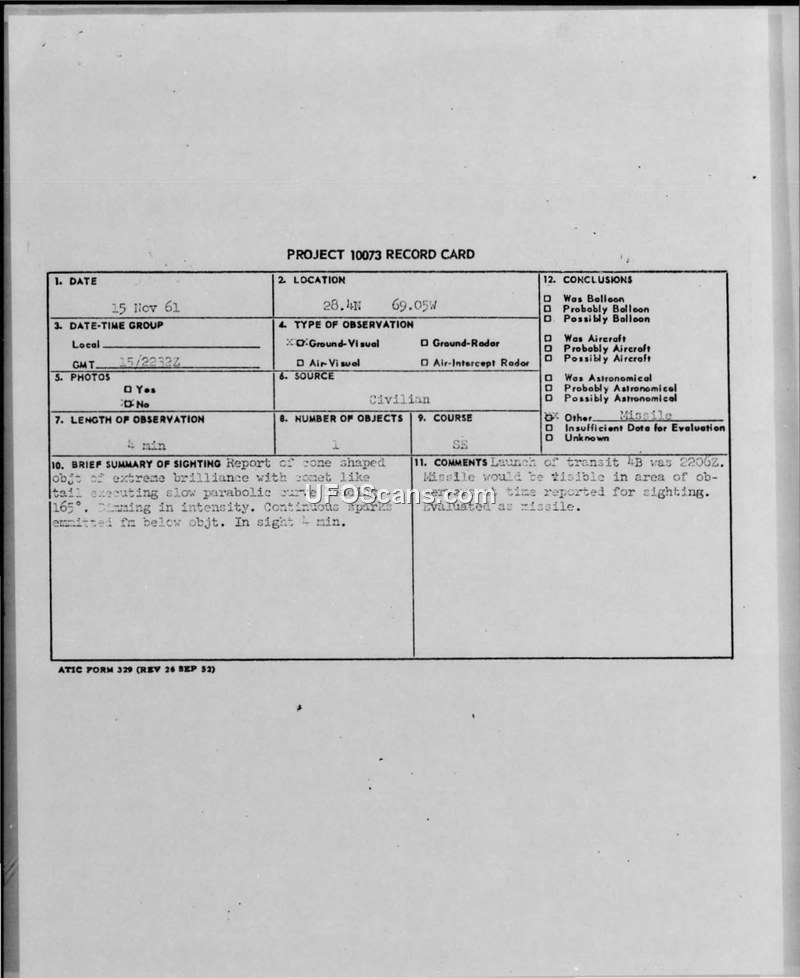 The sighting was determined to be the launch of the Transit 4B satellite, which occurred at 2205Z on 15 November 1961.