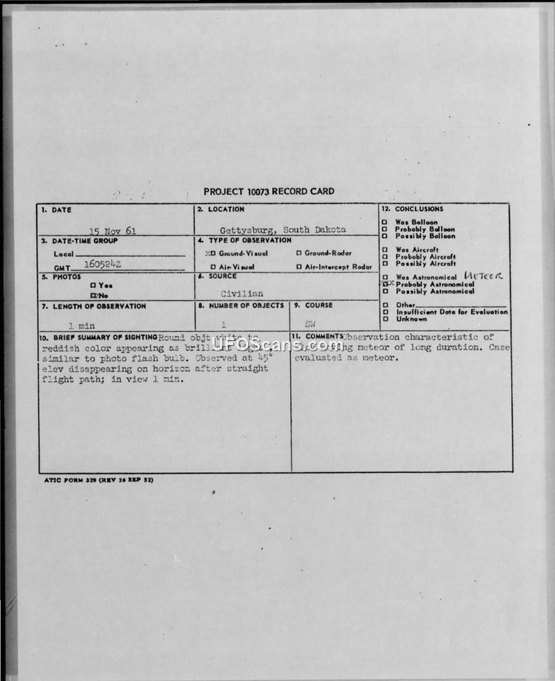 This document consists of a Project 10073 record card and an associated incoming military message regarding a UFO sighting near Gettysburg, South Dakota, on November 15, 1961. At approximately 1605Z, a single, circular object was observed by three individuals, including a state highway patrolman and two FAA controllers, all of whom were deemed reliable. The witnesses described the object as an unusually brilliant light, similar to a photo flash bulb, which varied in color from brilliant white to reddish white. Its size was estimated to be between that of a baseball and a basketball. The object was observed for one minute, moving in a straight path on a southwesterly course, with no maneuvers reported. It was seen halfway between the zenith and the horizon, eventually disappearing over the horizon. The weather conditions at the time were reported as good and clear. The military report explicitly notes that no military or civilian flights were reported in the area at the time of the sighting. The official conclusion reached by the Air Technical Intelligence Center was that the observation was characteristic of a slow-moving meteor of long duration, and the case was subsequently closed as a meteor sighting.