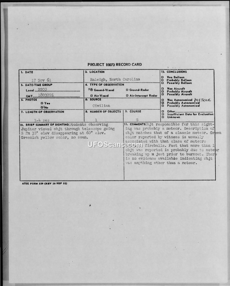 A student in Raleigh, NC, reported a greenish-yellow light in the sky on November 17, 1961. Air Force intelligence evaluated the report and concluded the object was a meteor.
