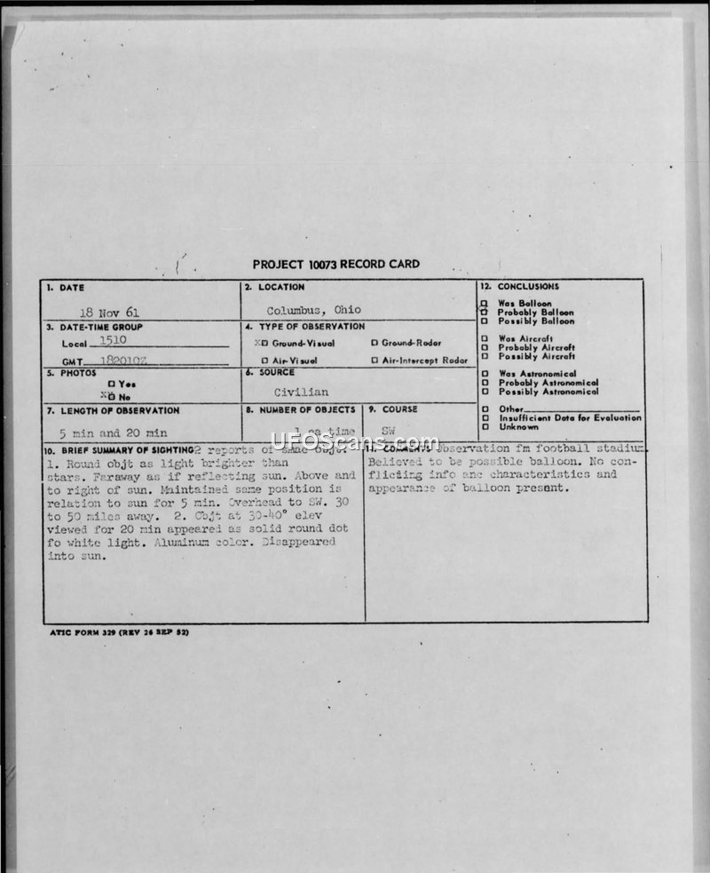 Project 10073 Record Card — Columbus, Ohio, 18 November 1961