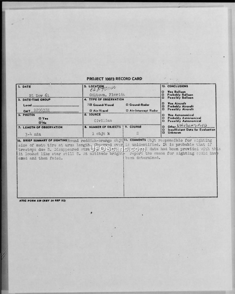 This document consists of a Project 10073 record card and an accompanying Air Force incoming message regarding an Unidentified Aerial Phenomena (UAP) sighting that occurred on November 22, 1961, near Oldtown, Florida. Two civilian witnesses, identified as employees of the State Road Department and the Shaw Ford Motor Company respectively, reported observing a round, reddish-orange object. The witnesses described the object as being approximately the size of an automobile tire when viewed at arm's length. The sighting lasted between three and four minutes. According to the report, the object was initially observed just above the treetops at an azimuth of 180 degrees. It moved straight upward without exhibiting any other directional motion. At a higher altitude, the object appeared similar to a star, then brightened significantly before slowly fading and disappearing. The weather conditions at the time were described as clear with bright moonlight. Lt. Lewis R. Stark, a Radar Maintenance and Operations Officer, was contacted by phone at approximately 0100Z on November 22, 1961, and proceeded to the scene to interview the witnesses. Lt. Stark noted that this was the third time this particular phenomenon had been reported in the area, though it was the first time it had been formally reported to his station. The official conclusion recorded on the Project 10073 card is that the object remains unidentified, with the caveat that additional data might have allowed for a definitive determination of the cause. The report was transmitted via military channels to various Air Force commands, including the Air Defense Command and the Air Technical Intelligence Center (ATIC).