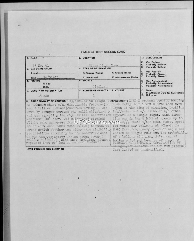 Project 10073 Record Card — Sioux City, Iowa, 24 November 1961