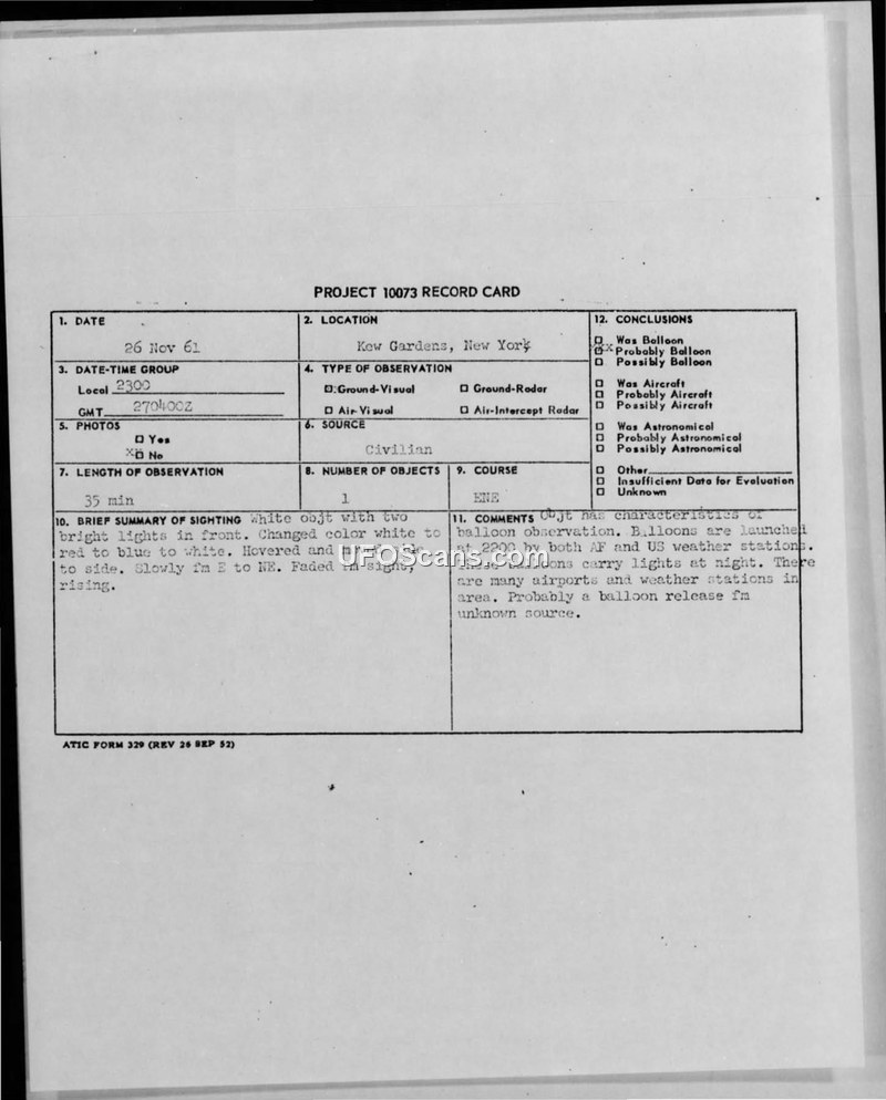 This document contains a Project 10073 record card and associated correspondence regarding a UFO sighting reported in Kew Gardens, New York, on November 26, 1961. The witness, a chemical engineering student at Queens College, reported observing an object with two bright lights in front at approximately 2300 hours. The witness described the object as initially white, then changing colors between blue and red, and noted that it hovered before moving from East to Northeast. The witness observed the object through a telescope and reported that it appeared to become 'hazy' or 'fuzzy' as it moved away. The witness also stated that two other individuals witnessed the event. The Foreign Technology Division at Wright-Patterson Air Force Base evaluated the initial report and determined that it lacked sufficient information, subsequently sending questionnaires to the witness and witnesses for further detail. The final conclusion recorded on the project card suggests the object was likely a weather balloon, noting that both Air Force and civilian weather stations frequently launch balloons with lights at night in that region. The documentation includes the original letter from the witness, the completed Air Force technical information sheets, and internal Air Force correspondence regarding the handling of the report.