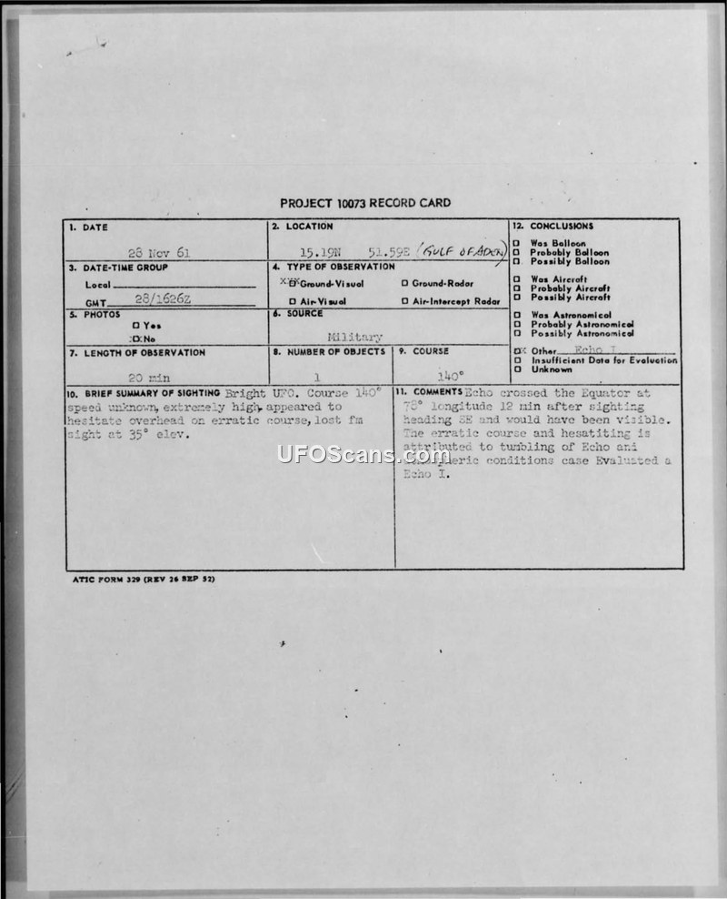 A sighting of a bright object in the Gulf of Aden on November 28, 1961, was reported by the USS MILLS. The object was officially identified by ATIC as the Echo I satellite.