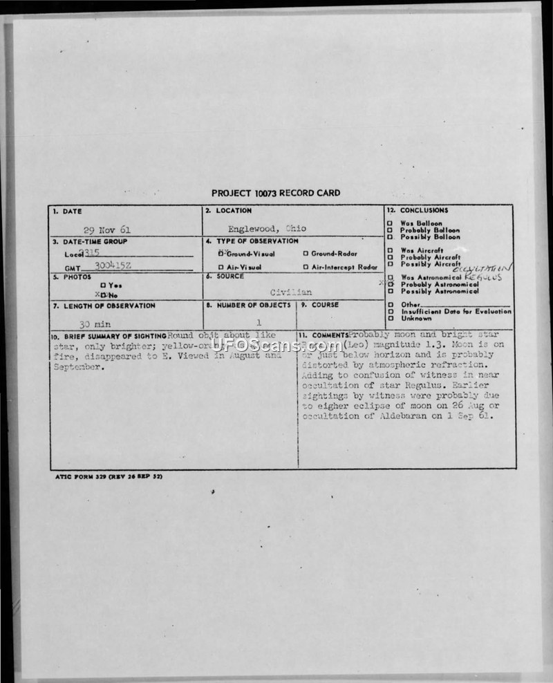 Project 10073 Record Card — Englewood, Ohio, 29 Nov 61
