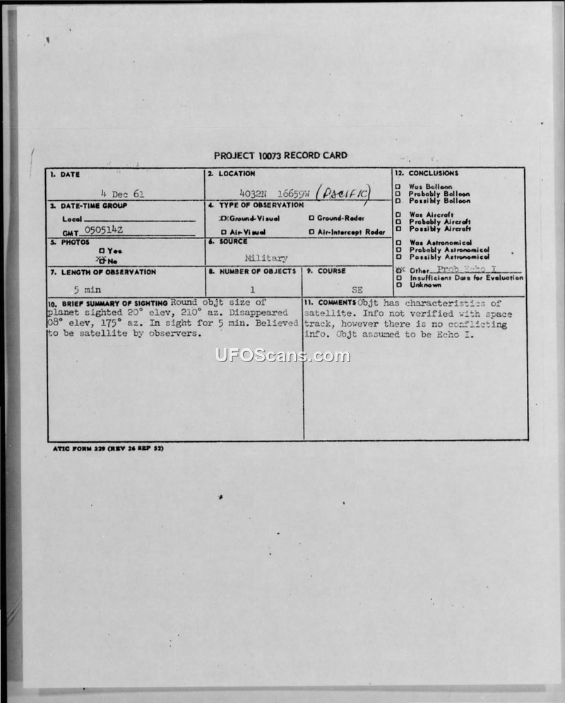 On December 4, 1961, at 050514Z, personnel aboard the USS Wilhoite, located at 40°32'N 166°59'W in the Pacific Ocean, observed a round, bright object. The sighting lasted for five minutes. The object was first observed at an elevation of 20 degrees and a bearing of 210 degrees, and it disappeared at an elevation of 8 degrees and a bearing of 175 degrees. The object traveled from north to south in a straight line. The observation was made using both the unaided eye and binoculars. The sighting was confirmed by the Commanding Officer, Executive Officer, Officer of the Deck, and four other crew members. Weather conditions were reported as clear to partly cloudy. The official evaluation concluded that the object exhibited the characteristics of a satellite. Although the information was not verified against space tracking data, there was no conflicting information, and the object was assumed to be the Echo I satellite. The report was processed through various military channels, including CINCPACFLT and USAF PAC, and documented on a Project 10073 record card.