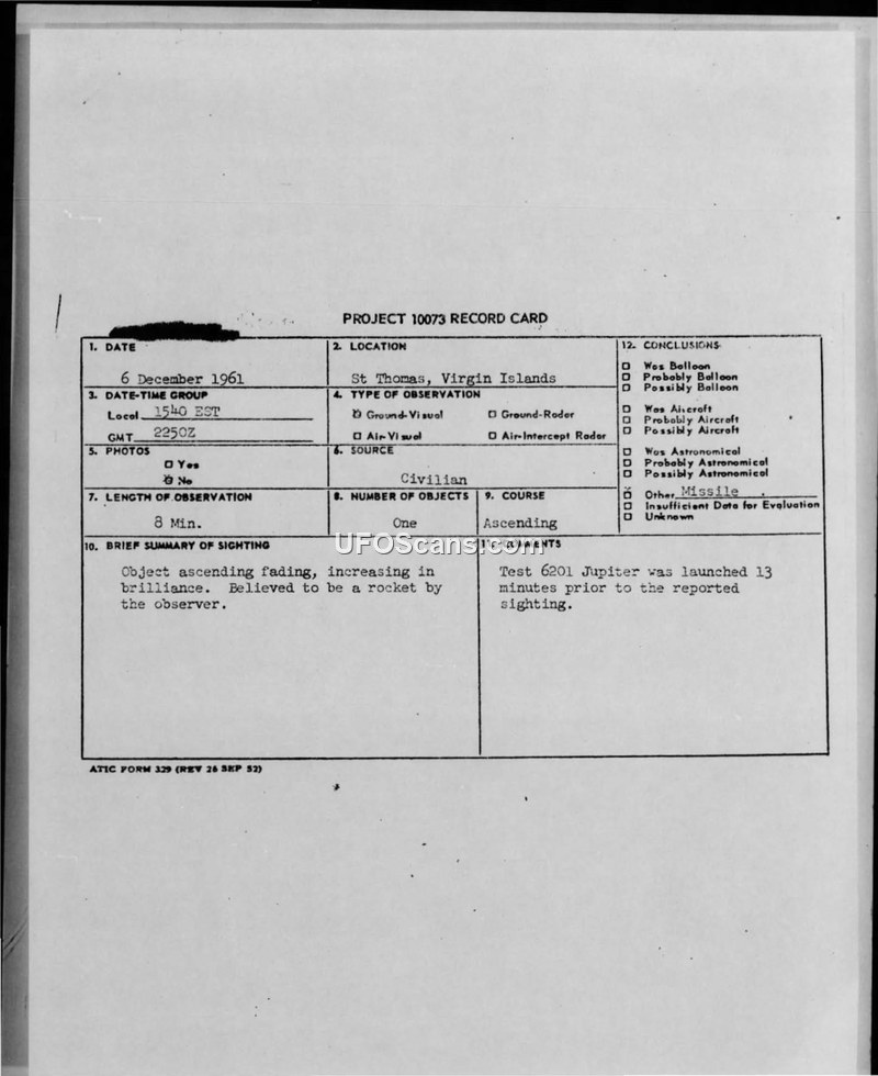 A civilian sighting of an unidentified object in the Virgin Islands on December 6, 1961, was investigated by the Air Tactical Intelligence Center. The object was officially identified as a Jupiter rocket launch.