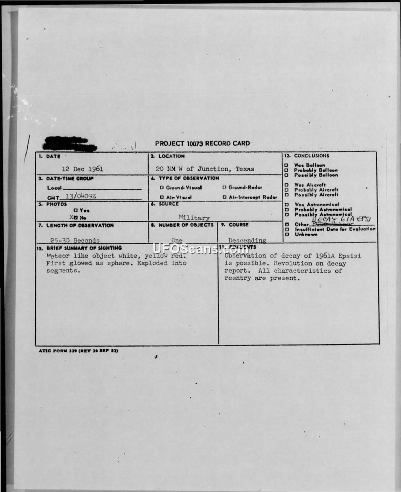 On December 13, 1961, at 0409Z, two pilots flying a T-29 aircraft on a night navigation training mission observed an aerial phenomenon approximately 20 nautical miles west of Junction, Texas. The pilots, assigned to the 3610th NTW, reported seeing a meteor-like object that initially appeared as a white, spherical glow. The object, described as 'pea size' from their perspective, descended vertically and underwent two explosive disintegrations, changing color from white to yellow and finally to a reddish-yellow glow before breaking into four or more segments and disappearing. The observation lasted between 25 and 30 seconds. The pilots noted that the object's atmospheric entry was significantly brighter and more prolonged than other meteor sightings they had witnessed during their mission. The incident was reported via official Air Force channels to the Air Technical Intelligence Center (ATIC) and other commands. Official evaluations recorded on the Project 10073 record card suggest the phenomenon was likely the decay of the 1961A Epsisi rocket body, noting that all characteristics of a reentry event were present. The wing intelligence officer concurred with this assessment, classifying the object as a probable meteor or rocket body.