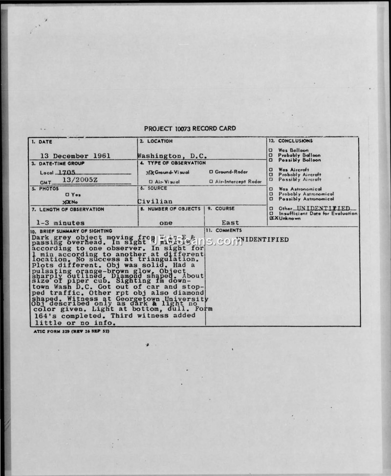 On 13 December 1961, at approximately 1705 local time, a diamond-shaped object was sighted over Washington, D.C. The object, described as dark grey with a pulsating orange-brown glow, was observed by multiple witnesses, including a former Navy pilot and flight instructor. The object moved in a straight line from west to east, passing over the George Washington University area toward Washington National Airport. Witnesses reported that the object was solid, approximately 20 feet in length, and made no sound, nor did it leave an exhaust trail. One witness, who was driving, stopped his vehicle and exited to obtain a clearer view, noting that the object appeared to have a thickness proportional to its size. The sighting lasted between one and three minutes. Official military records, including incoming messages from the 1100th Operations Group at Bolling AFB, categorized the object as a 'circular with four tips' or 'diamond' shape, approximately 15 to 20 feet in size. Despite attempts at triangulation, no successful radar data was obtained, as the object was reportedly too low and obscured by city clutter. J. Allen Hynek, in correspondence with Major William T. Coleman, remarked that the witness's experience as a flier suggested the report should be taken seriously, noting that the object did not resemble any conventional aircraft, as it lacked wings, rotors, or navigation lights. The official conclusion for the incident remained 'UNIDENTIFIED'.