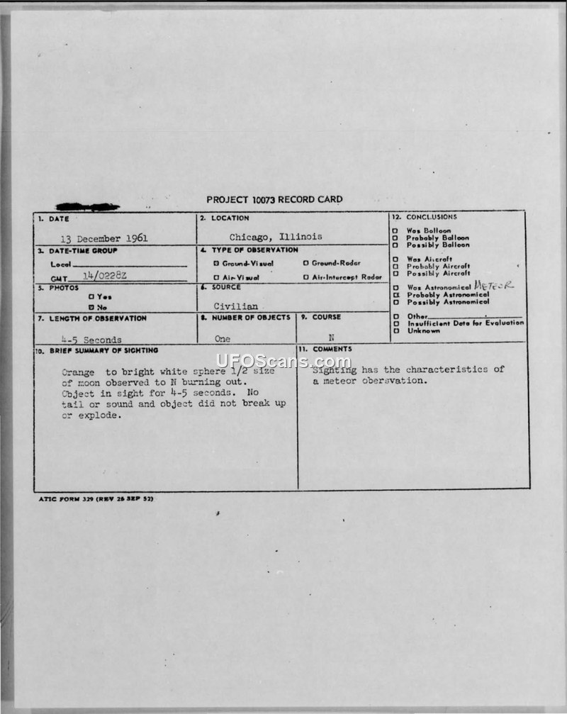 Project 10073 Record Card — Chicago, Illinois, 13 December 1961