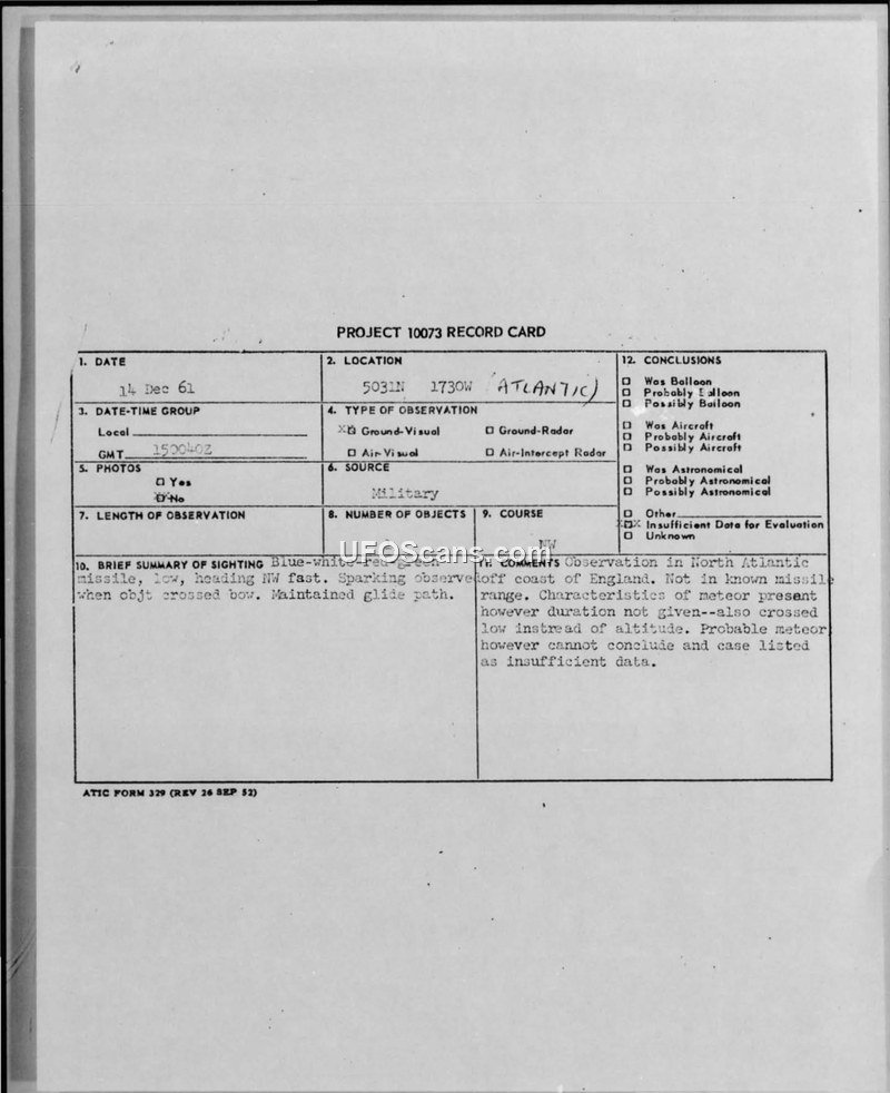 On December 14, 1961, at 150040Z, a sighting of an unidentified aerial object was reported by the USNS General W. O. Darby in the North Atlantic, specifically at coordinates 50.31N 17.30W. The object was described as blue, white, red, and green in color, moving at a fast speed on a northwesterly heading. The witness reported that the object maintained a glide path and exhibited a 'sparking' effect as it crossed the ship's bow from port to starboard. At the time of the observation, the weather conditions were reported as cloudy with a rough sea and wind from the south-southeast at Force 7. The incident was documented via a staff message and subsequently processed on a Project 10073 record card. The official evaluation noted that the object was not within any known missile range. While the characteristics observed were consistent with a meteor, the lack of duration data and the fact that the object maintained a low altitude rather than a typical meteoric trajectory led investigators to conclude that there was insufficient data to make a definitive identification. The case was ultimately filed under the category of insufficient data for evaluation.