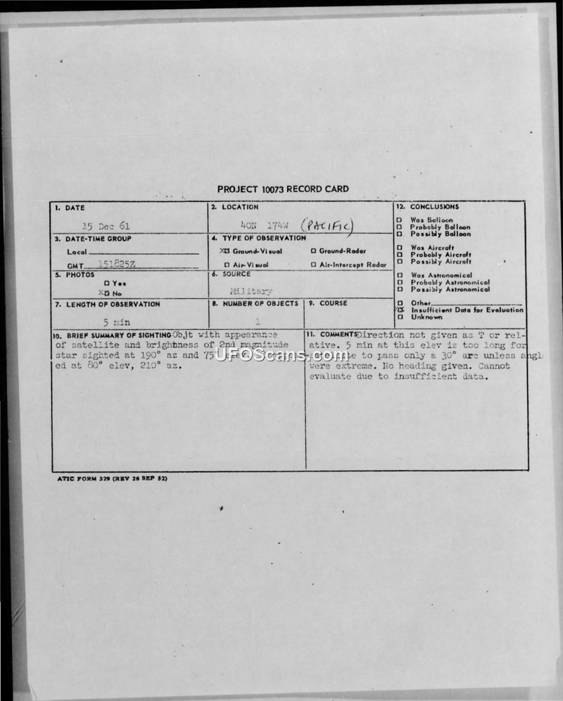 Project 10073 Record Card — USS Lansing DER 388 Sighting, 15 Dec 61