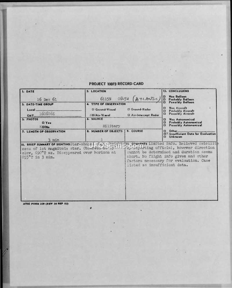 A star-shaped object was sighted by an aircraft crew over the Atlantic on December 16, 1961. The incident was evaluated as a probable satellite, but ultimately classified as having insufficient data for a formal conclusion.