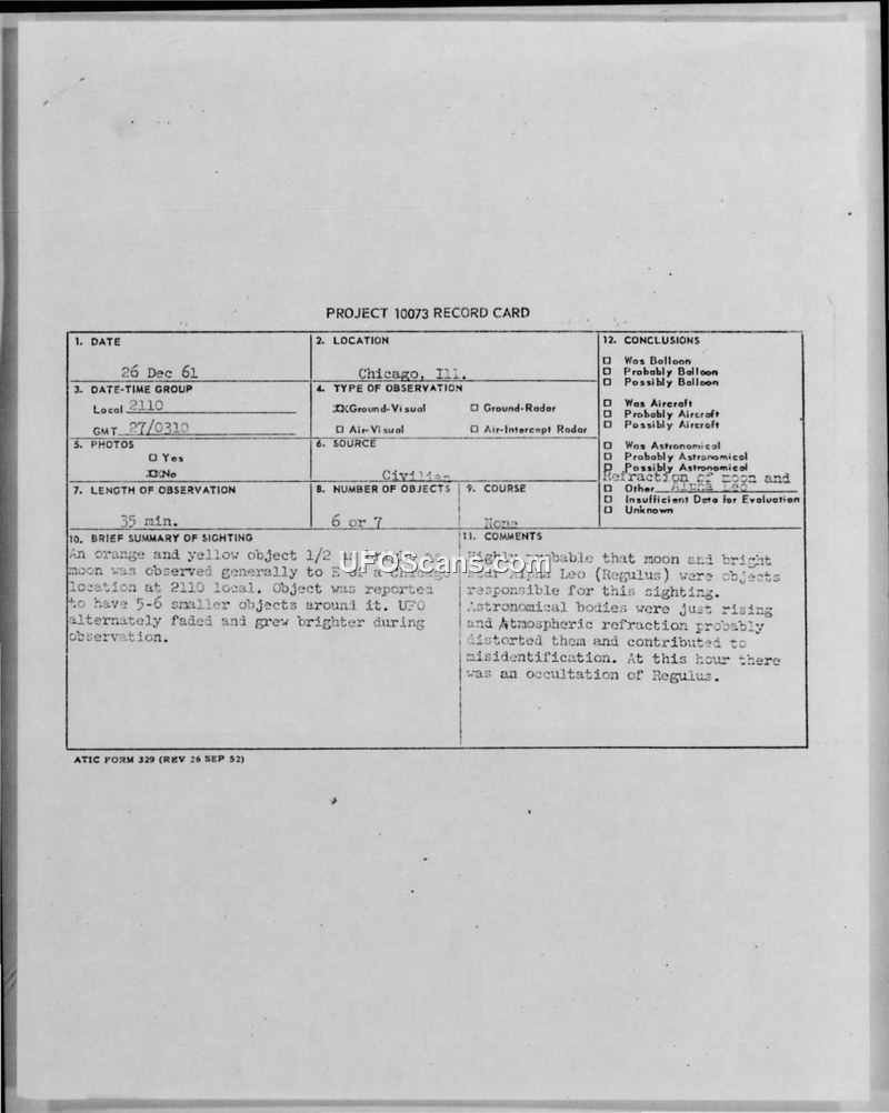 A 1961 sighting of multiple objects in Chicago was investigated by the Air Technical Intelligence Center. The phenomenon was officially attributed to the atmospheric refraction of the moon and the star Regulus.