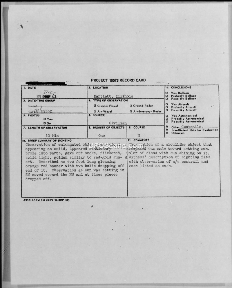 A 1961 sighting report from Bartlett, Illinois, where a witness observed an elongated, glowing object. The U.S. Air Force investigated the incident and concluded it was an aircraft contrail illuminated by the setting sun.