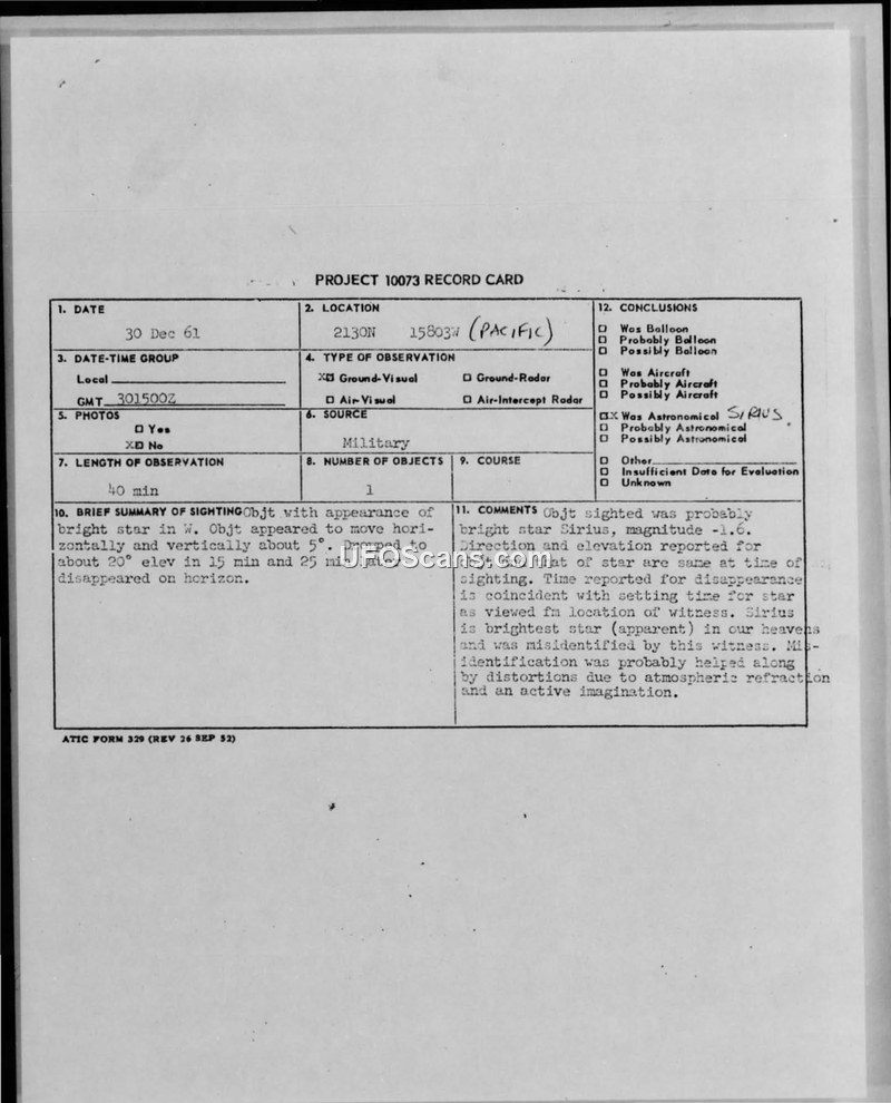 A military observer reported an unidentified object on December 30, 1961, which was subsequently identified by the Air Force as the star Sirius. The report includes a Project 10073 record card and a formal military message regarding the sighting.