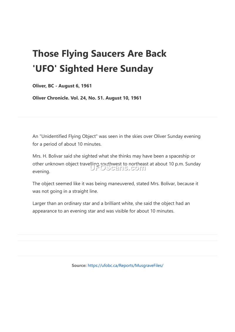A newspaper report from the Oliver Chronicle details a 10-minute sighting of a brilliant white, maneuvering object over Oliver, BC, on August 6, 1961, as reported by witness Mrs. H. Bolivar.