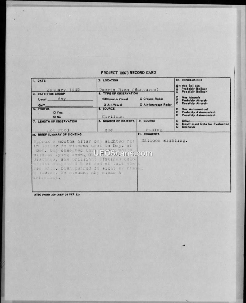 A civilian in Santurce, Puerto Rico, reported a high-altitude sighting of a platinum-colored, star-shaped object with a tail in January 1962. The Department of Defense officially classified the incident as a balloon sighting.