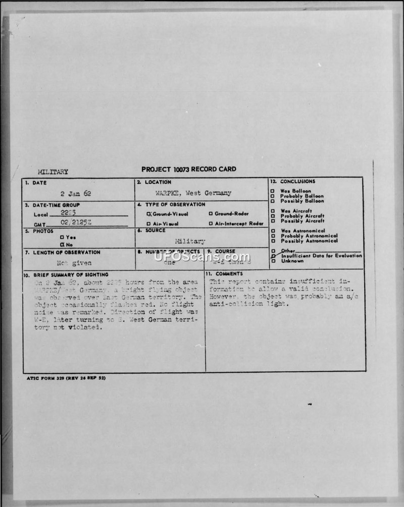 Project 10073 Record Card — Warpke, West Germany, 2 Jan 62