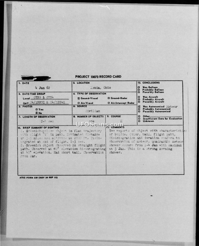 A civilian in Xenia, Ohio, reported a greenish-yellow object on January 4, 1962. The Air Force investigation concluded the object was a bolide meteor associated with the Quadrantids shower.