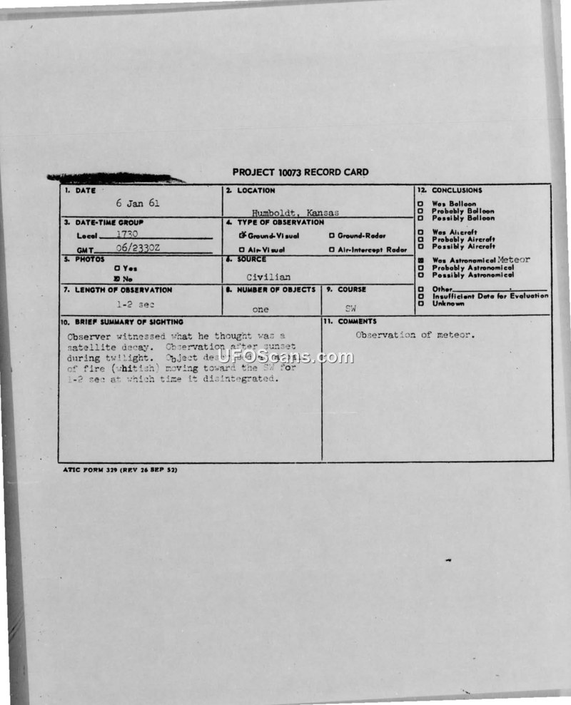 Project 10073 Record Card — Humboldt, Kansas, 6 January 1961