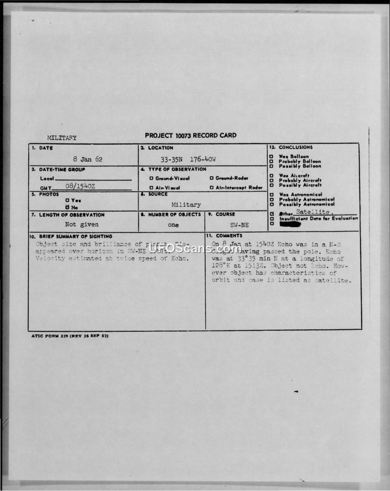 This document consists of a Project 10073 record card and an associated incoming Department of the Air Force staff message dated January 8, 1962. The report details a sighting of an unidentified object at coordinates 33°35'N, 176°40'W. The witness described the object as having the size and brilliance of a planet, appearing over the horizon in a southwest-to-northeast orbit. The estimated velocity of the object was noted as being twice the speed of the Echo satellite. The military report explicitly notes that the object was not the Echo satellite, which was in a north-south flight path at the time, having passed the pole. Despite the object not being identified as Echo, the final conclusion reached by the evaluating agency, ATIC, was that the object exhibited orbital characteristics consistent with a satellite. The message was distributed to various military commands, including CINCPAC, CINCNORAD, and COMUSJAPAN, among others. No photographic evidence or radar contact was reported in relation to this incident.