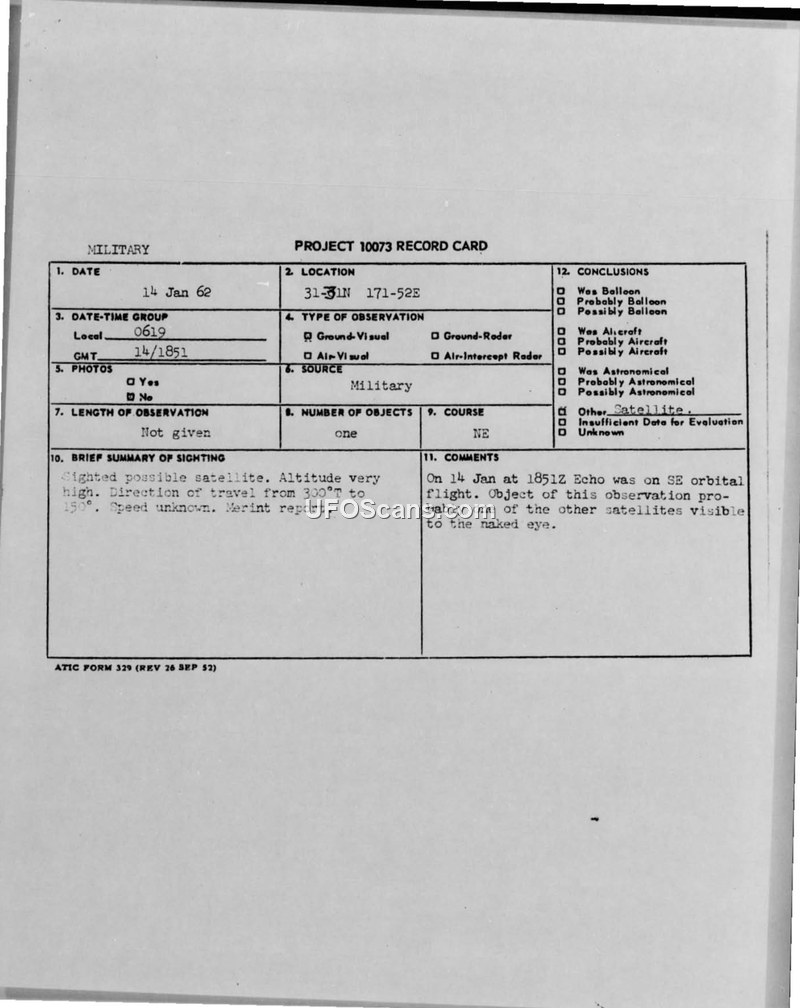 PROJECT 10073 RECORD CARD - 14 Jan 62